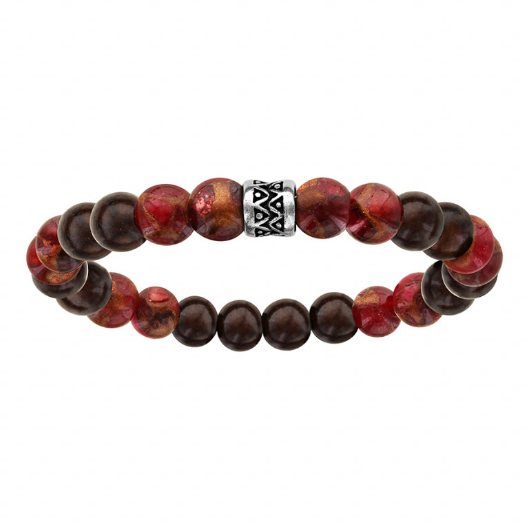 BRACELET ACIER EXTENSIBLE PERLES BOIS ET JASPÉITE ROUGE
